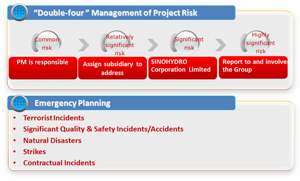 Quality, Occupation Health and Safety, Environmental Protection (QHSE) are each managed according the ISO 9001, 140001 and OHSAS 18001 standards, respectively. A QHSE Department created at the SINOHYDRO Group level coordinates and improves the management within the various entities.